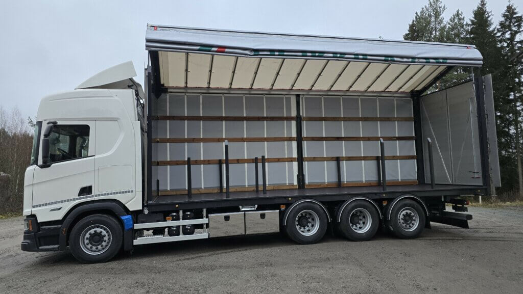 Asensimme sekä rahtilavaan että perävaunuun liukukatot, jotka voidaan avata edestä ja takaa.